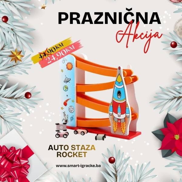 Drvena trkaća staza dolazi u setu sa četiri autića različitih boja i brojeva.