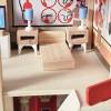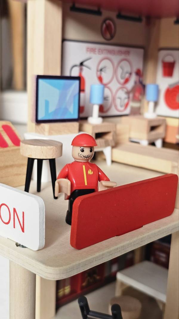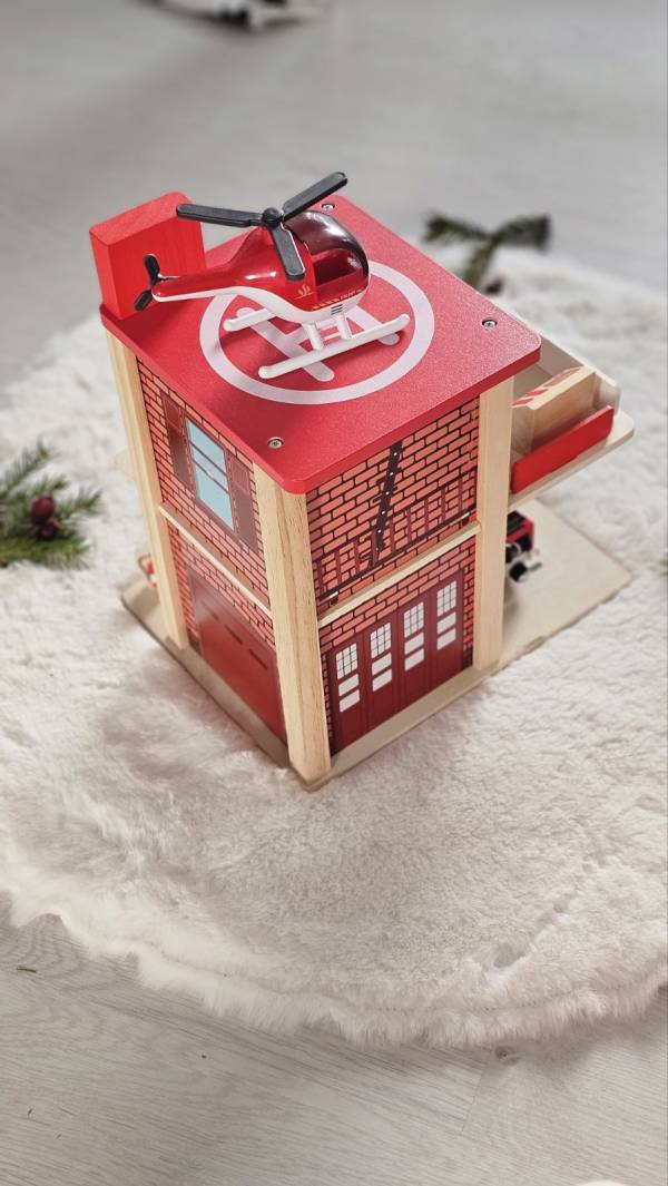 Konstrukcija vatrogasne stanice izrađena je od drveta, kao i svi ostali dodaci (krevet, stolice i dr.)